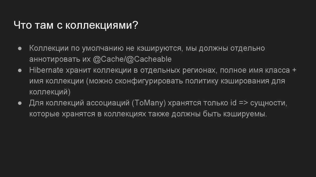 Что там с коллекциями?● Коллекции по умолчанию не кэшируются, мы должны отдельно