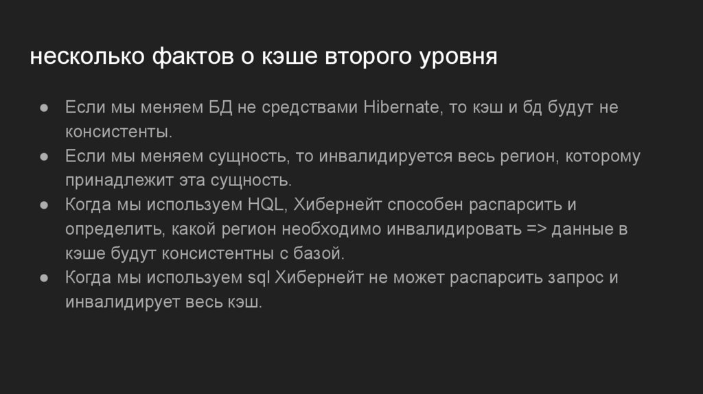 несколько фактов о кэше второго уровня● Если мы меняем БД не средствами Hibernate, то кэш и бд будут не