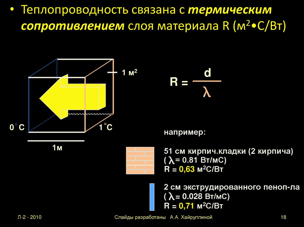 • Теплопроводность связана с термическимсопротивлением слоя материала R (м2•С/Вт)