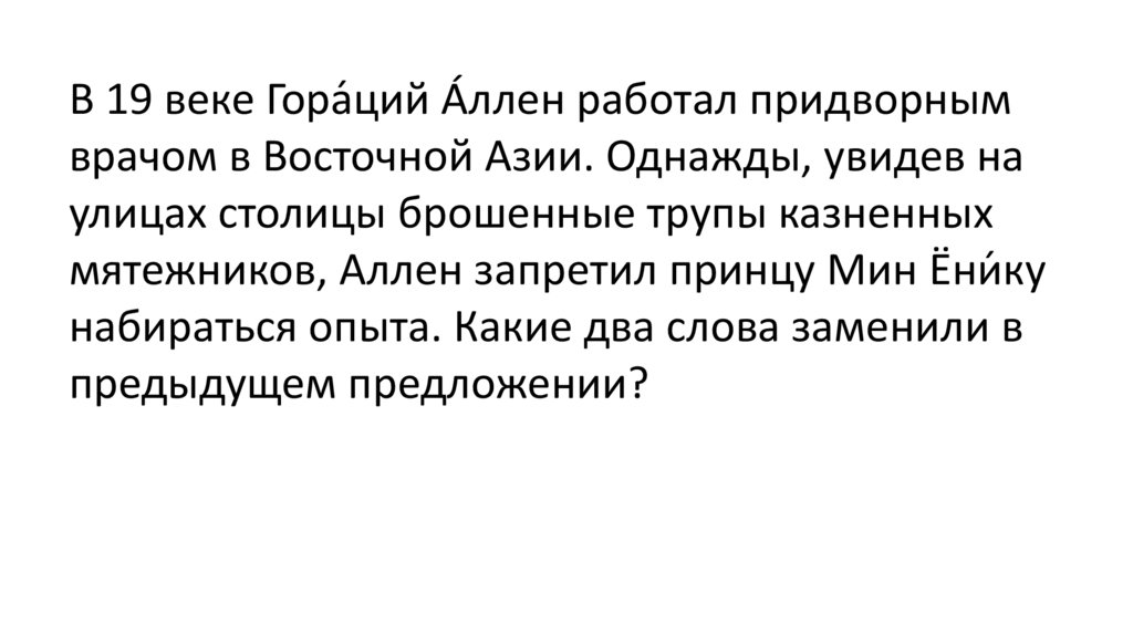 В 19 веке Гора́ций А́ллен работал придворнымврачом в Восточной Азии. Однажды, увидев на