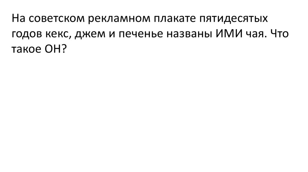 На советском рекламном плакате пятидесятыхгодов кекс, джем и печенье названы ИМИ чая. Что