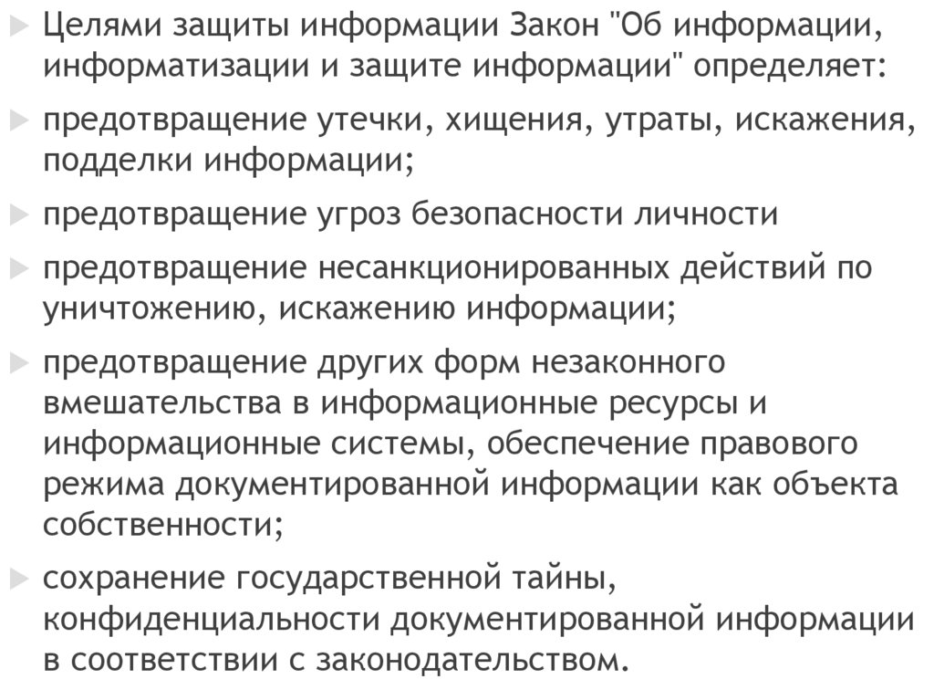 Целями защиты информации Закон "Об информации,информатизации и защите информации" определяет: