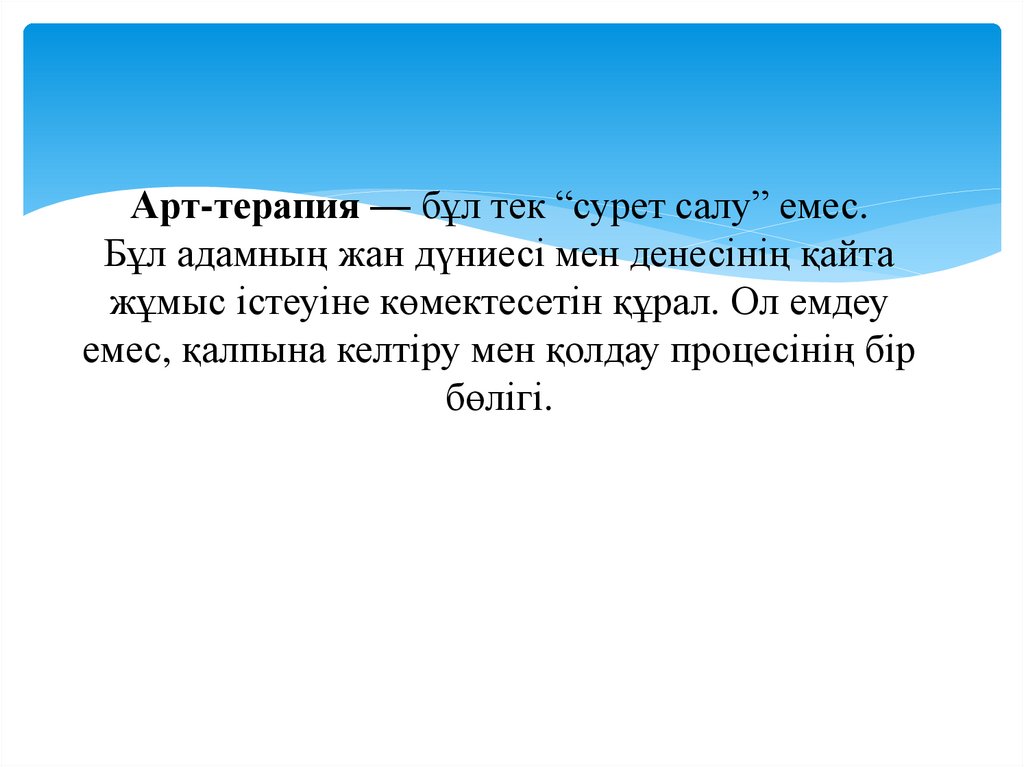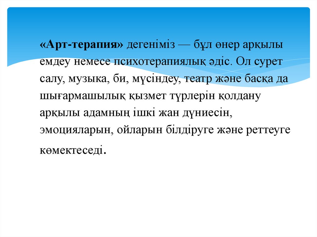 «Арт-терапия» дегеніміз — бұл өнер арқылыемдеу немесе психотерапиялық әдіс. Ол сурет