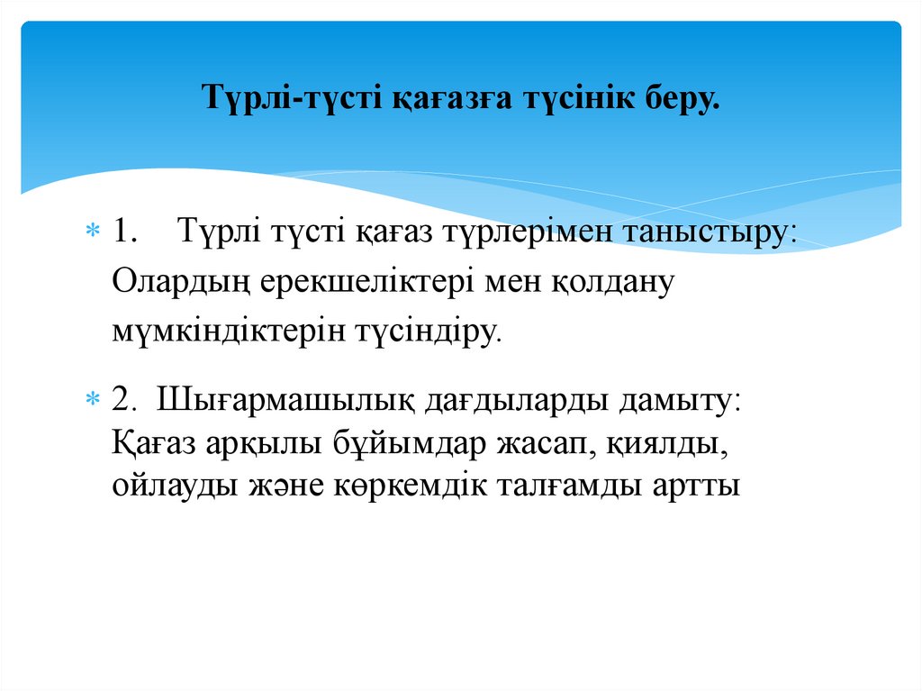 1. Түрлі түсті қағаз түрлерімен таныстыру:Олардың ерекшеліктері мен қолдану