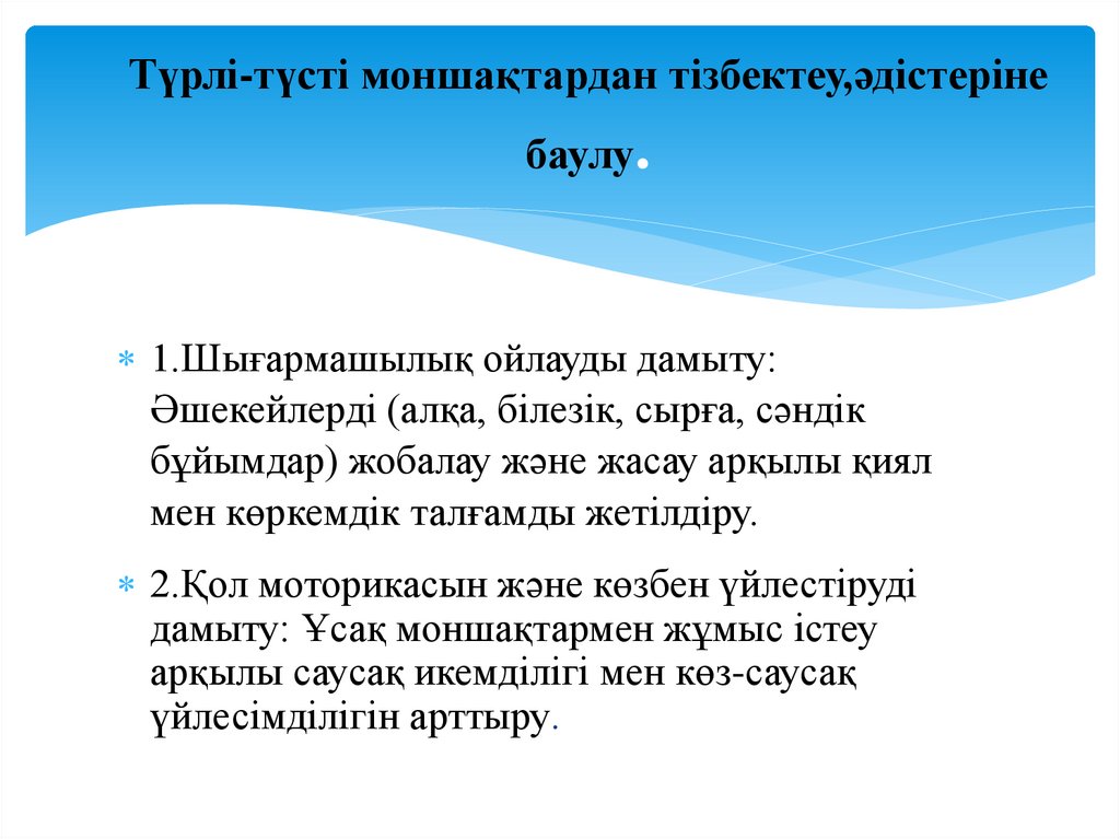1.Шығармашылық ойлауды дамыту:Әшекейлерді (алқа, білезік, сырға, сәндік