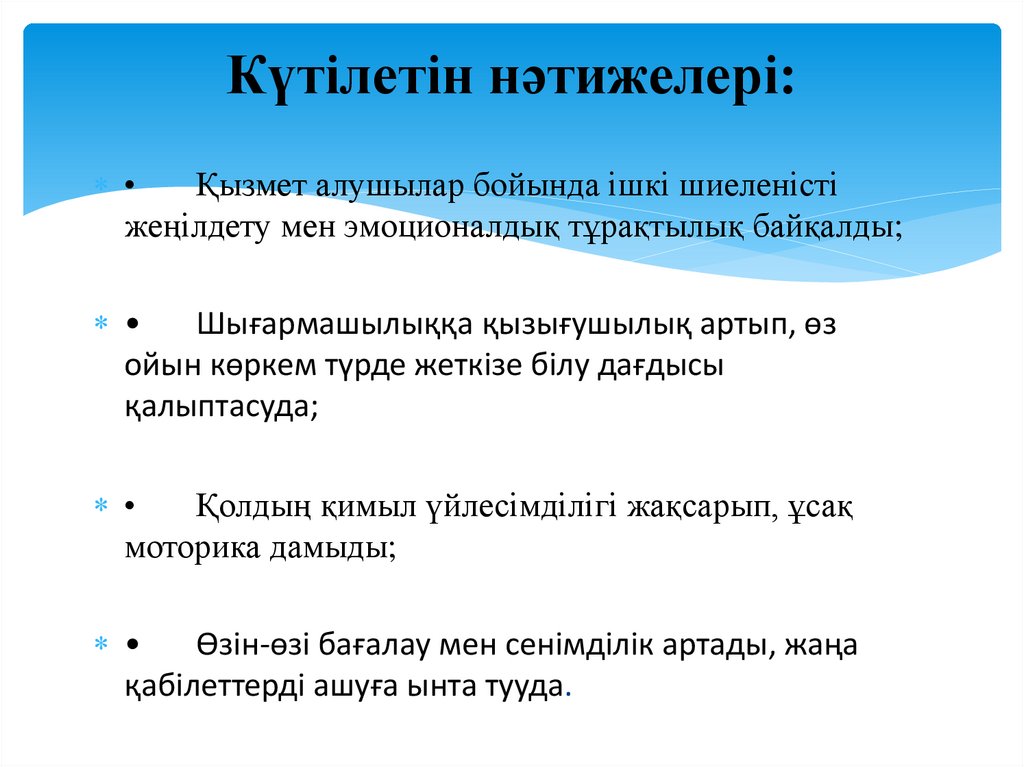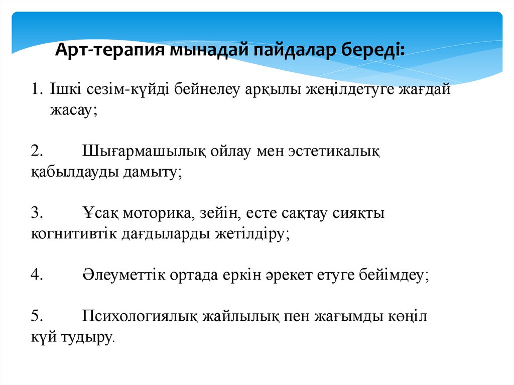 Арт-терапия мынадай пайдалар береді:1. Ішкі сезім-күйді бейнелеу арқылы жеңілдетуге жағдай
