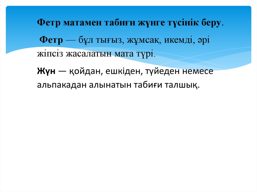Фетр матамен табиғи жүнге түсінік беру.Фетр — бұл тығыз, жұмсақ, икемді, әрі