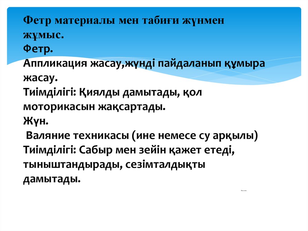 7. Фетр материалы мен табиғи жүнмен жұмыс. Фетр. Аппликация жасау,жүнді пайдаланып құмыра жасау. Тиімділігі: Қиялды дамытады, қол