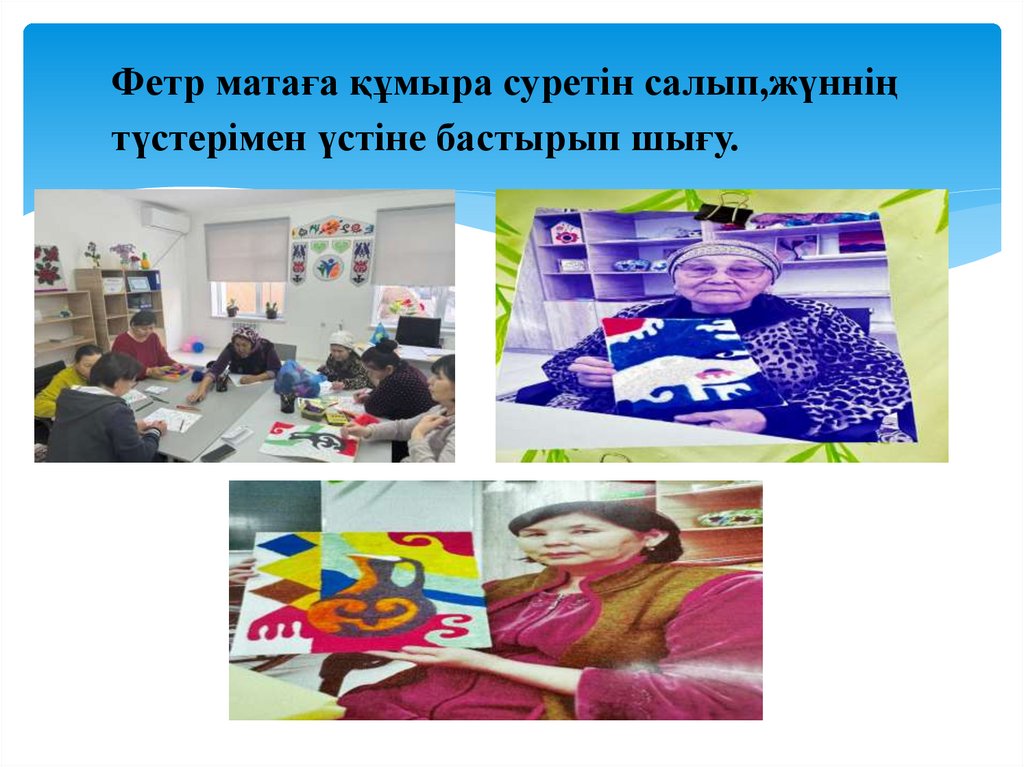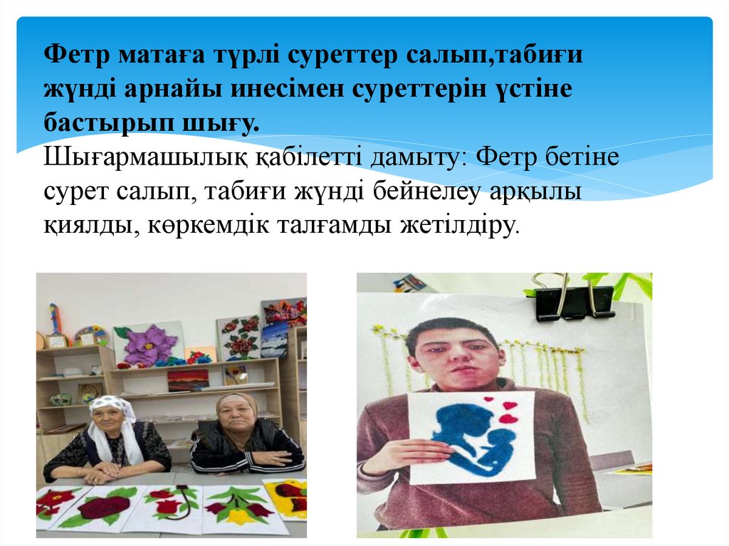 8. Фетр матаға түрлі суреттер салып,табиғи жүнді арнайы инесімен суреттерін үстіне бастырып шығу. Шығармашылық қабілетті дамыту: