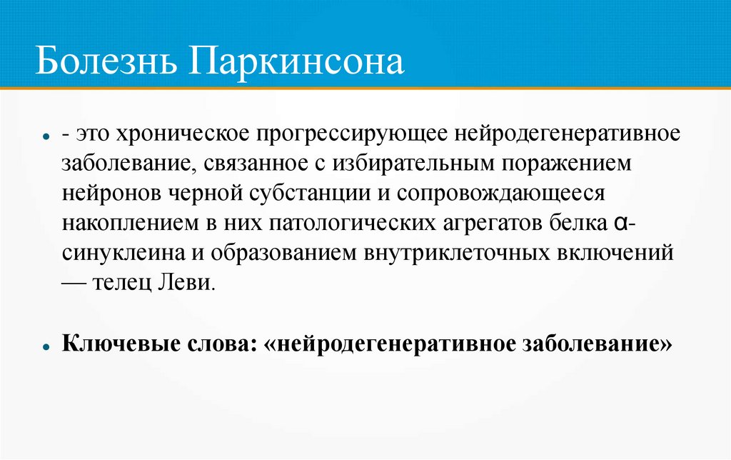 Болезнь Паркинсона- это хроническое прогрессирующее нейродегенеративное