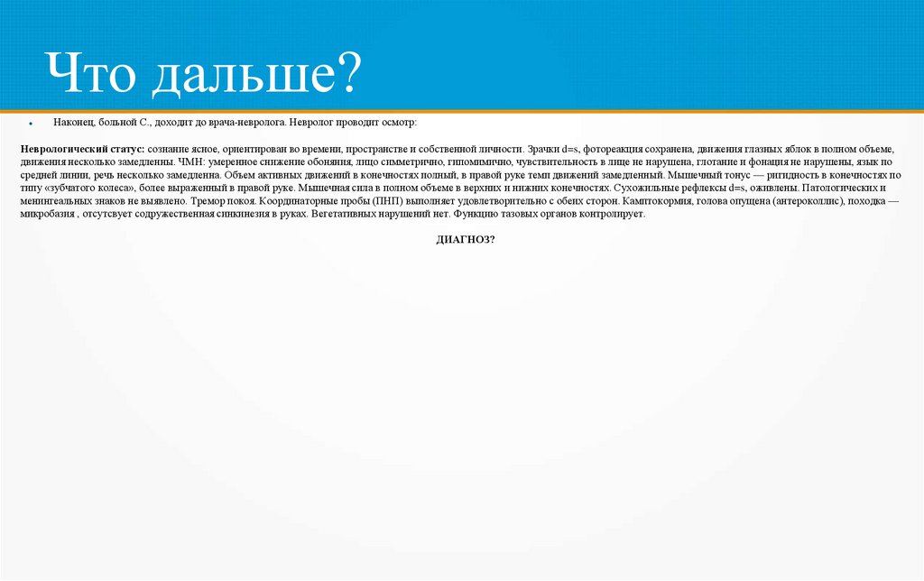Что дальше?Наконец, больной С., доходит до врача-невролога. Невролог проводит осмотр: