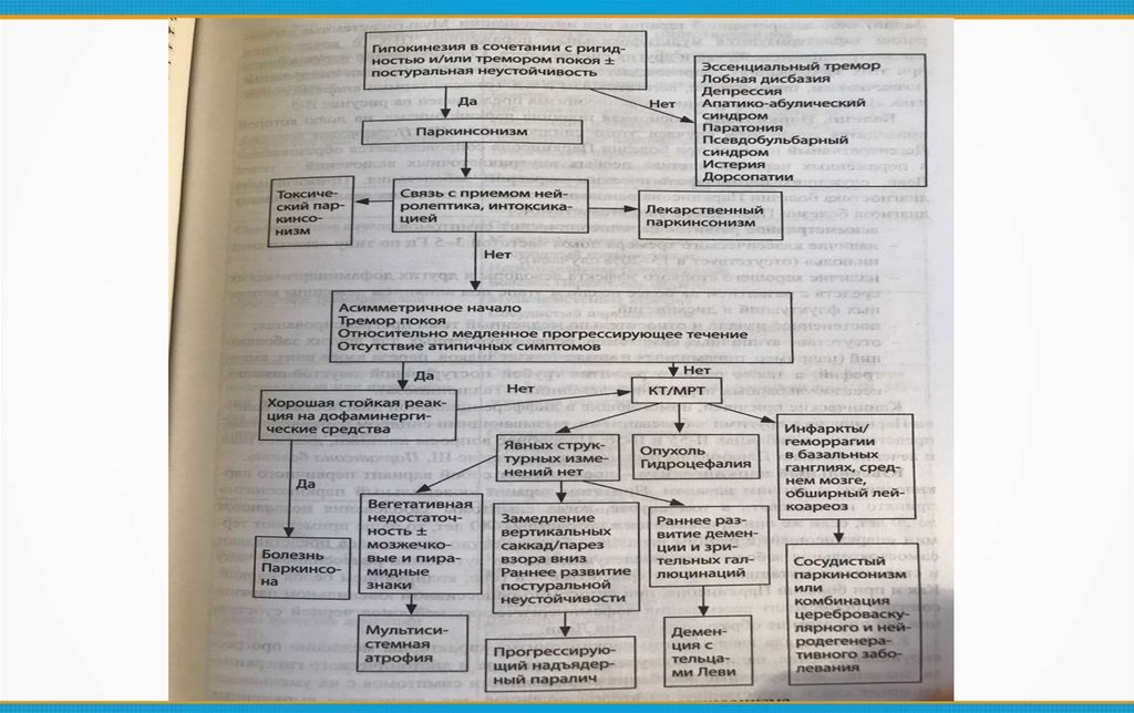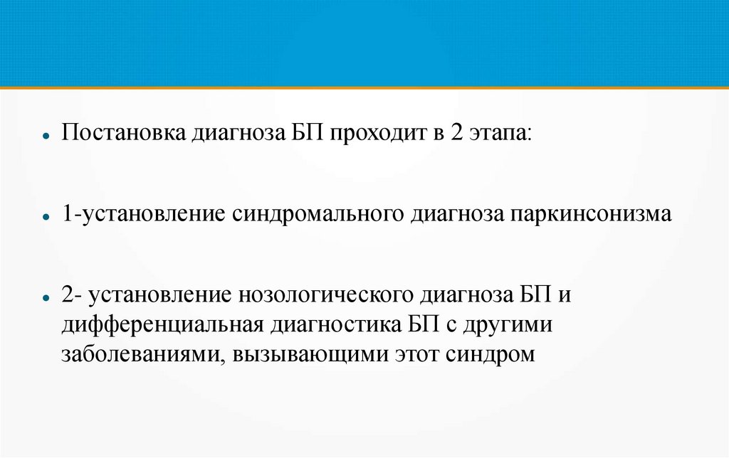 Постановка диагноза БП проходит в 2 этапа:1-установление синдромального диагноза паркинсонизма