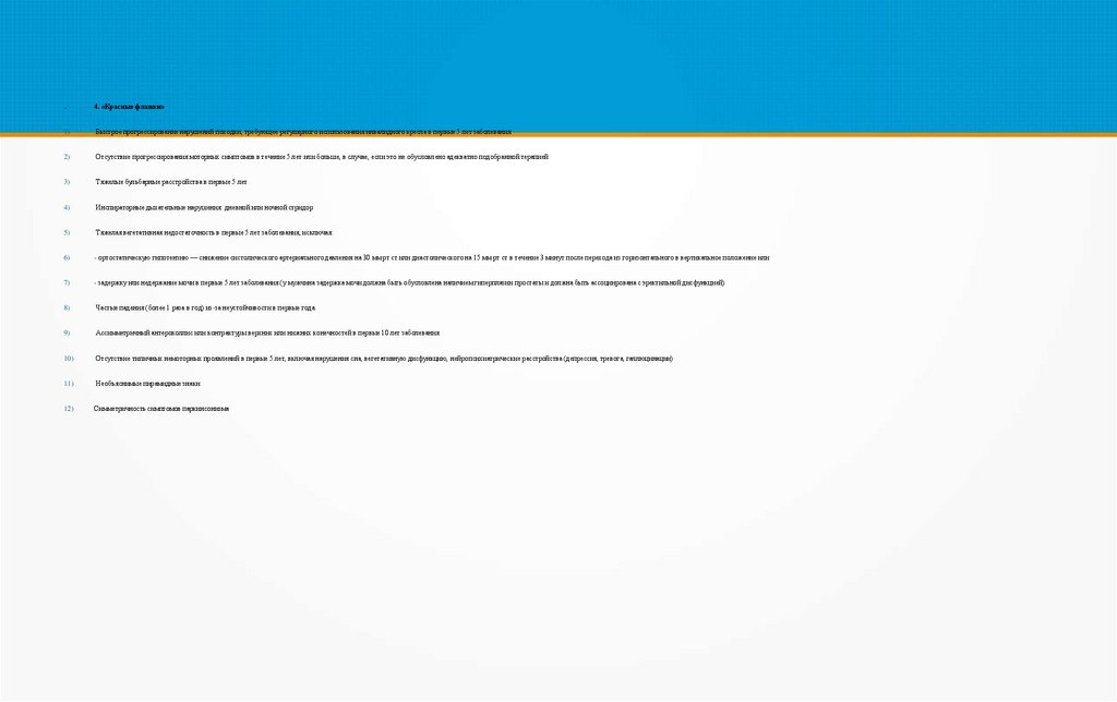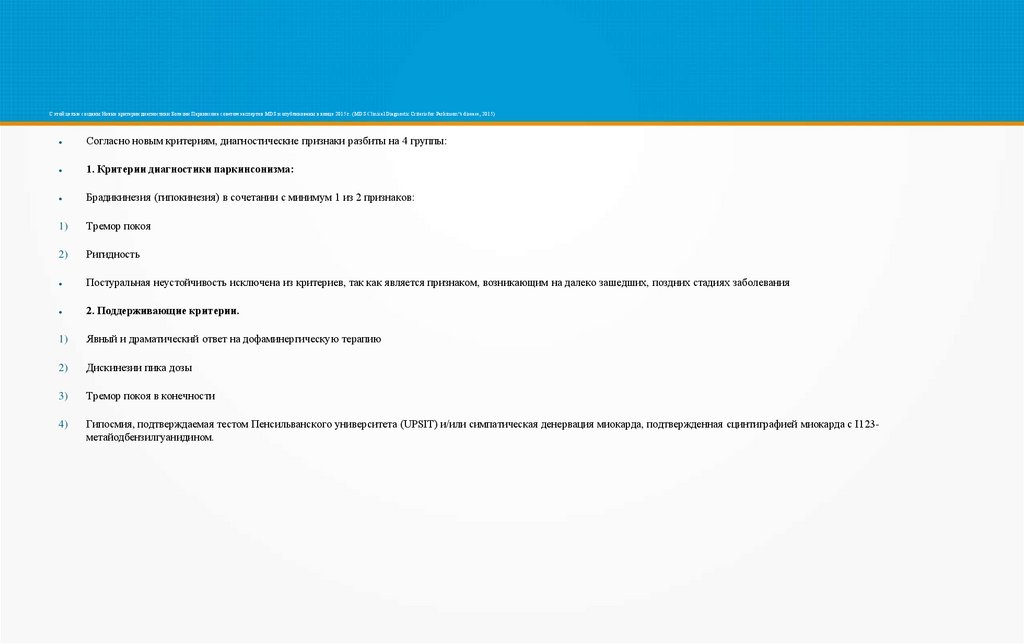С этой целью созданы Новые критерии диагностики Болезни Паркинсона советом экспертов MDS и опубликованы в конце 2015 г. (MDS Clinical Diagnostic Criteris for Parkinson“s disease, 2015)Согласно новым критериям, диагностические признаки разбиты на 4 группы:
