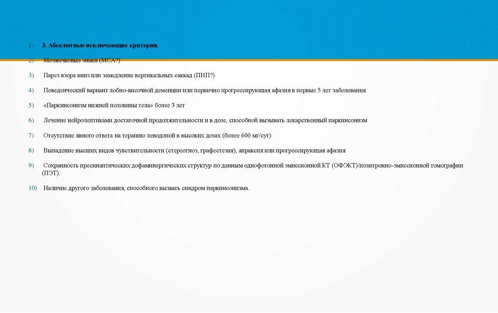 Постуральная неустойчивость исключена из критериев, так как является признаком, возникающим на далеко зашедших, поздних стадиях заболевания