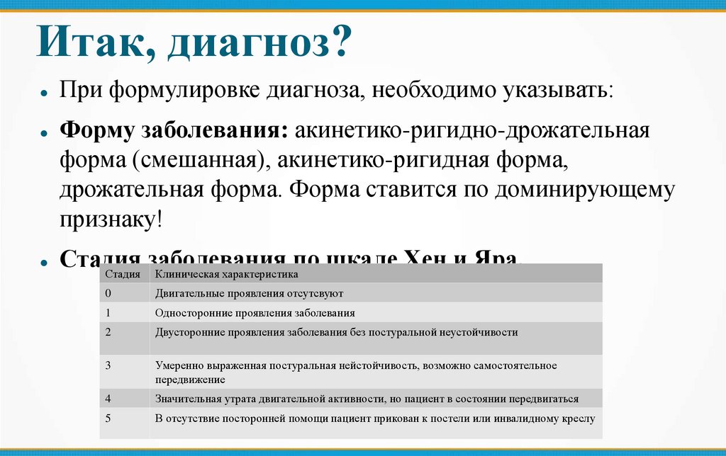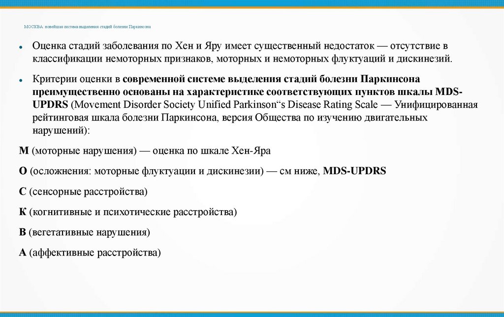 Критерии оценки в современной системе выделения стадий болезни Паркинсона