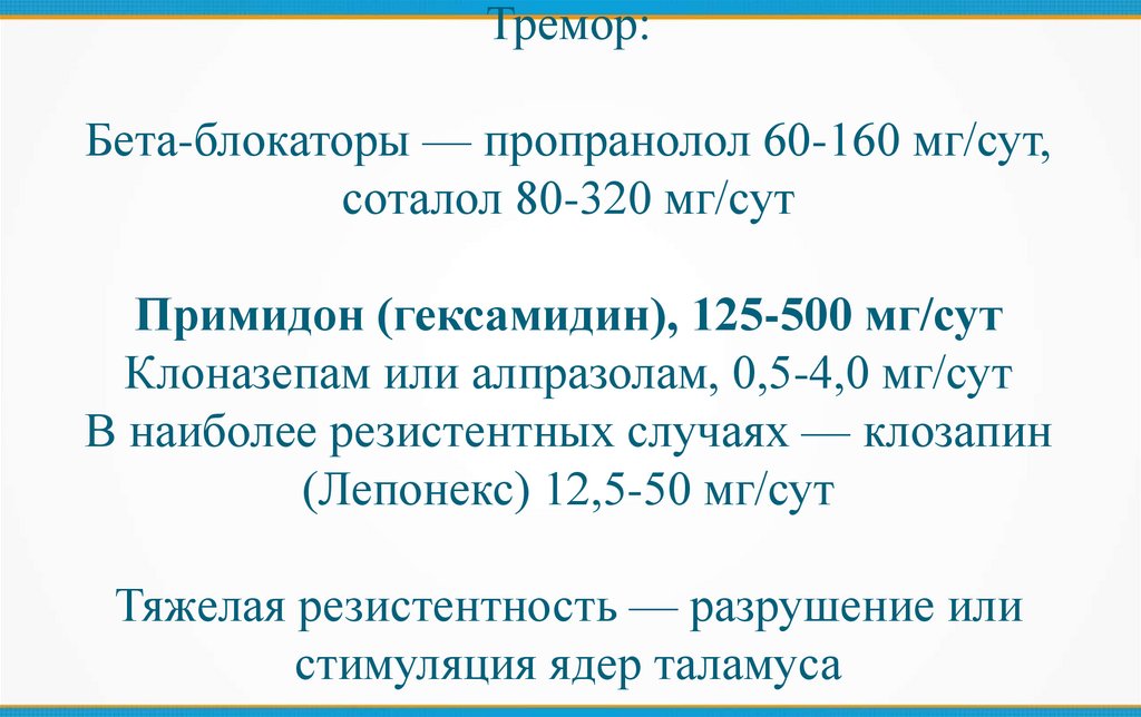 Тремор:Бета-блокаторы — пропранолол 60-160 мг/сут,