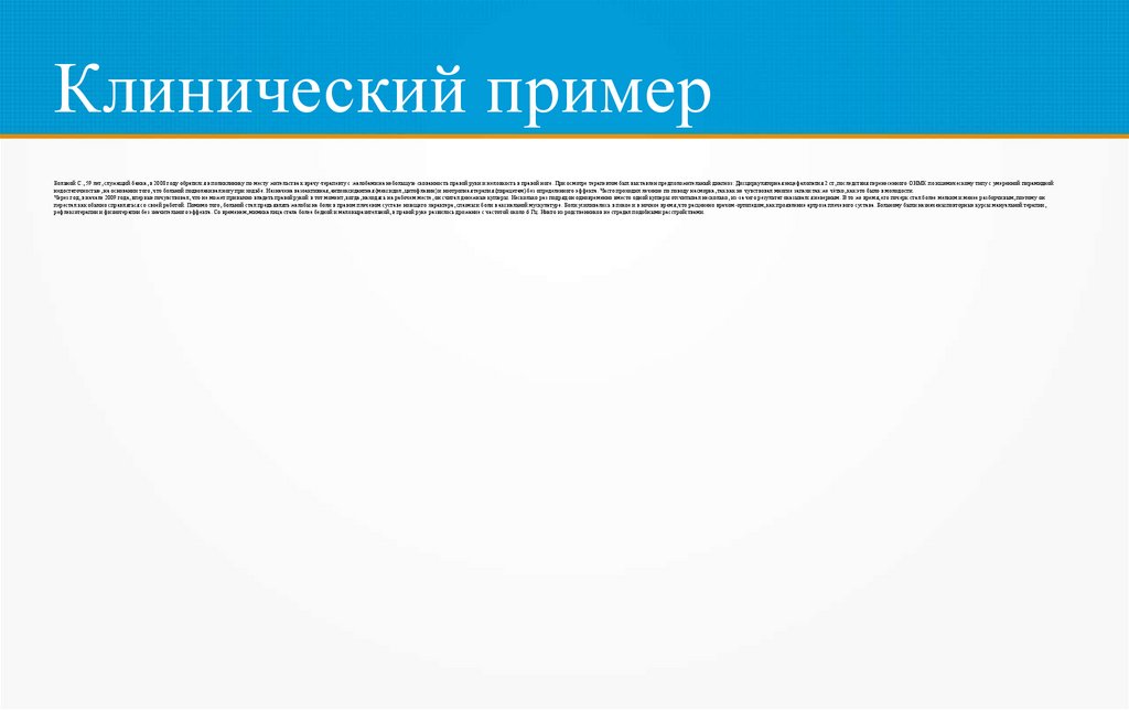 Клинический примерБольной С., 59 лет, служащий банка, в 2008 году обратился в поликлинику по месту жительства к врачу-терапевту с жалобами на небольшую скованность правой руки и неловкость в правой ноге. При осмотре терапевтом был выставлен предположительный диагноз: Дисциркуляторная энцефалопатия 2 ст, последствия перенесенного ОНМК по ишемическому типу с умеренной пирамидной