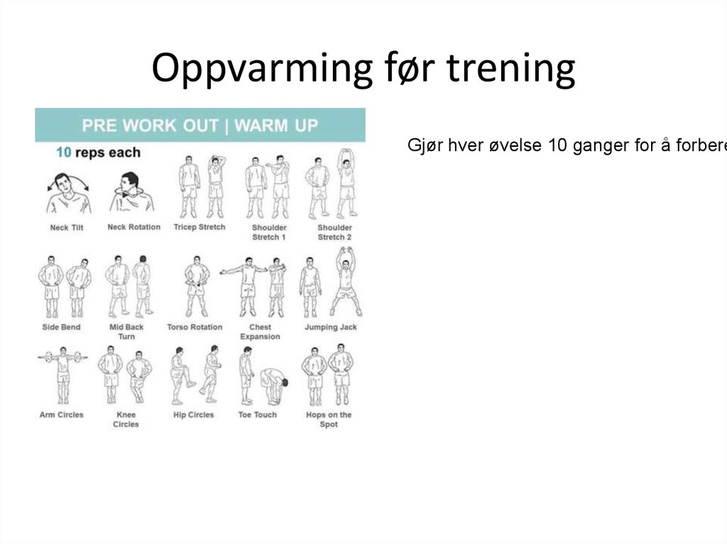 Oppvarming før treningGjør hver øvelse 10 ganger for å forbere