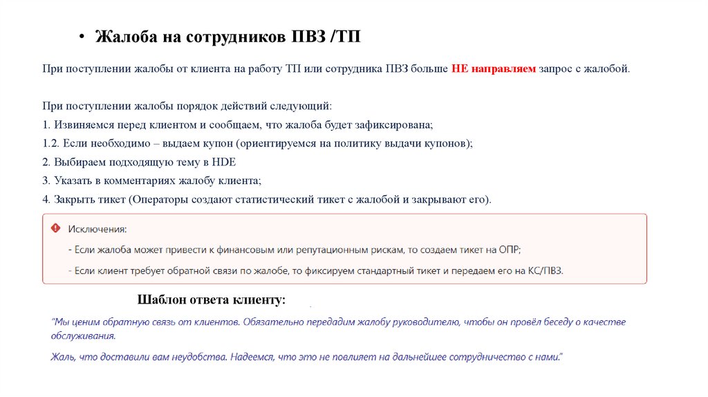• Жалоба на сотрудников ПВЗ /ТППри поступлении жалобы от клиента на работу ТП или сотрудника ПВЗ больше НЕ направляем запрос с жалобой.