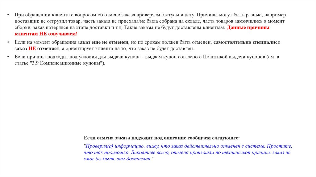 Если на момент обращения заказ еще не отменен, но по срокам должен быть отменен, самостоятельно специалист