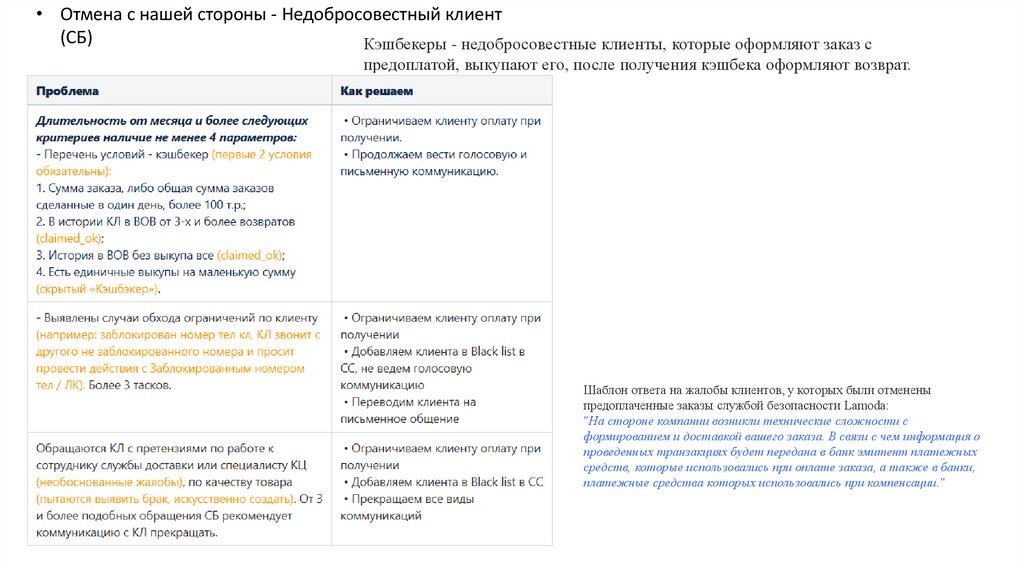 • Отмена с нашей стороны - Недобросовестный клиент(СБ)
