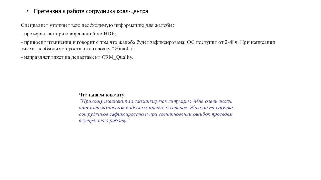 • Претензия к работе сотрудника колл-центраСпециалист уточняет всю необходимую информацию для жалобы: