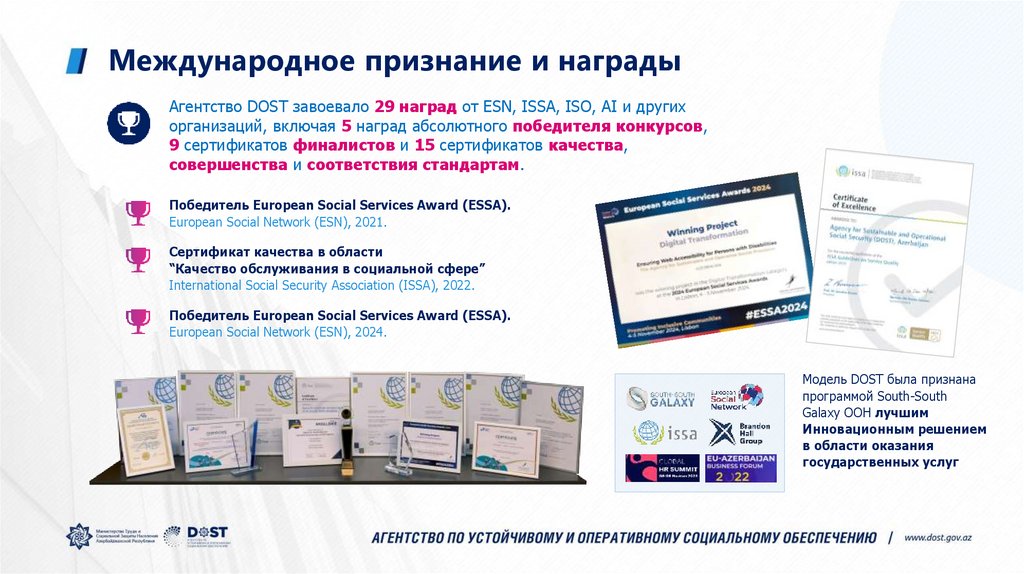 Международное признание и наградыАгентство DOST завоевало 29 наград от ESN, ISSA, ISO, AI и других