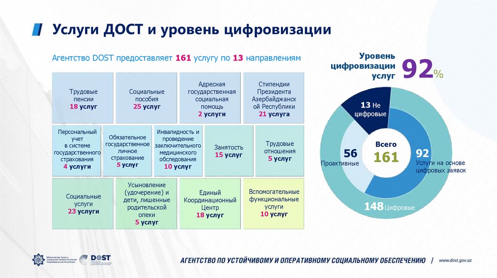 Услуги ДОСТ и уровень цифровизацииАгентство DOST предоставляет 161 услугу по 13 направлениям