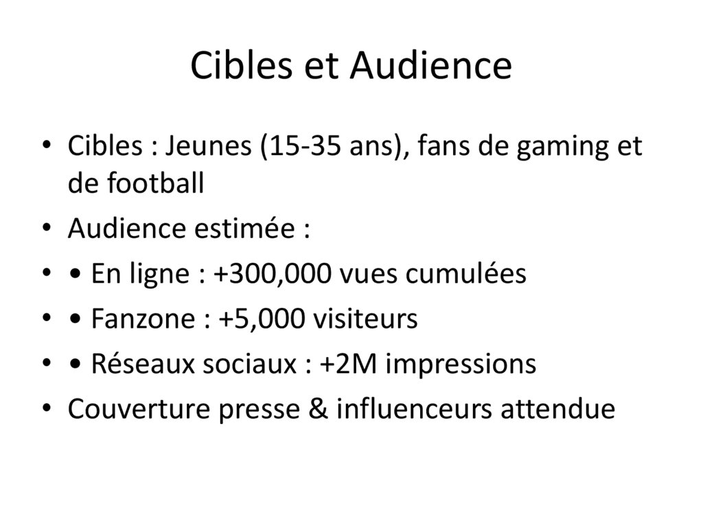 Cibles et Audience• Cibles : Jeunes (15-35 ans), fans de gaming et