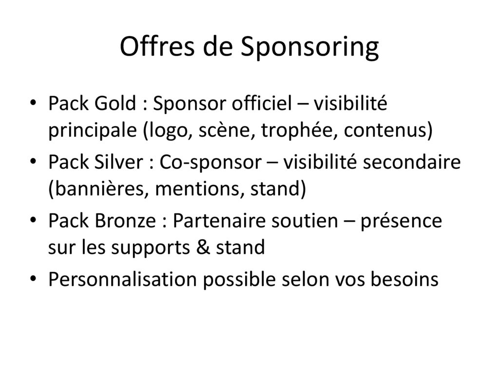 Offres de Sponsoring• Pack Gold : Sponsor officiel – visibilité