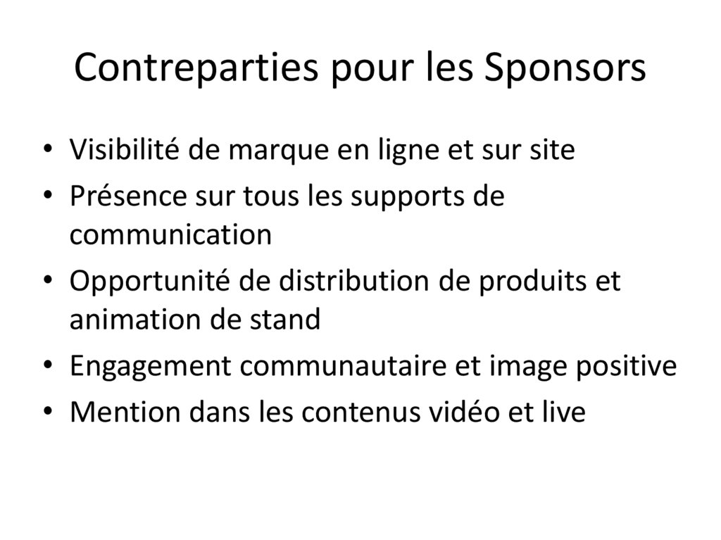 Contreparties pour les Sponsors• Visibilité de marque en ligne et sur site