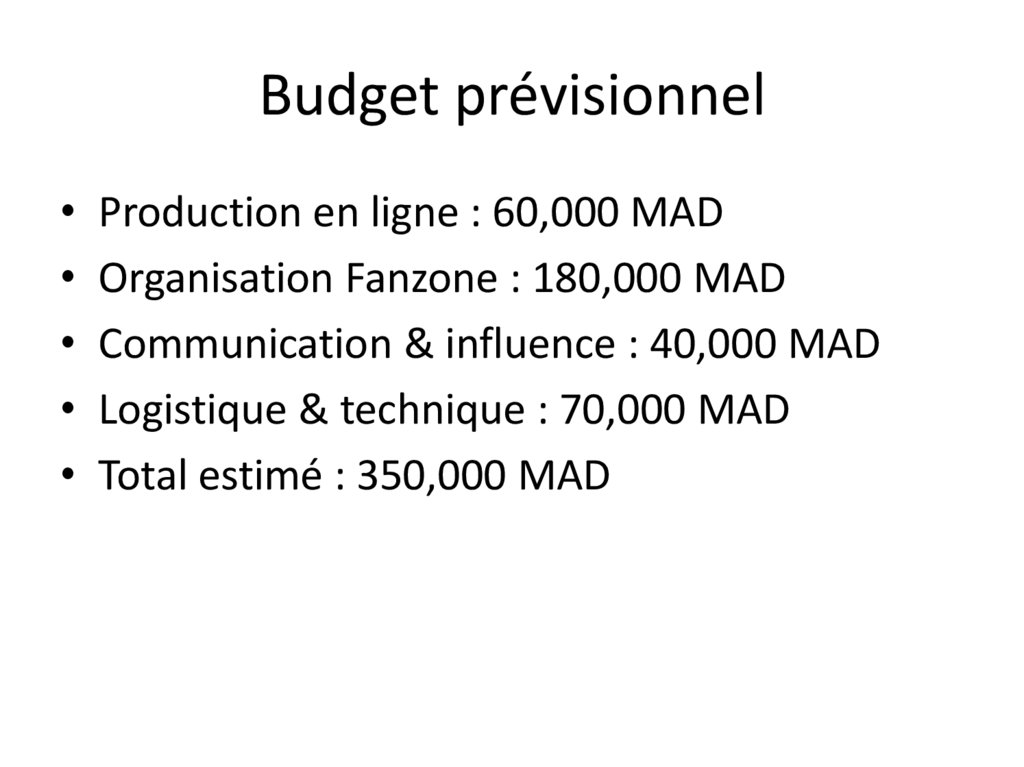 Budget prévisionnel• Production en ligne : 60,000 MAD