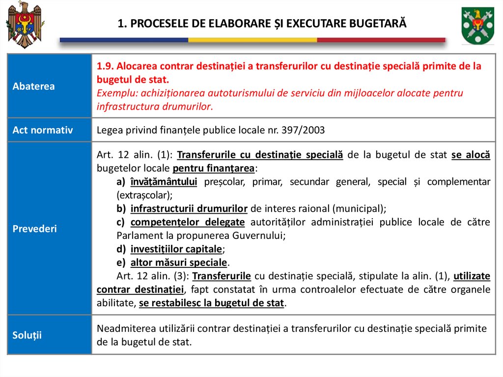 1.9. Alocarea contrar destinației a transferurilor cu destinație specială primite de la