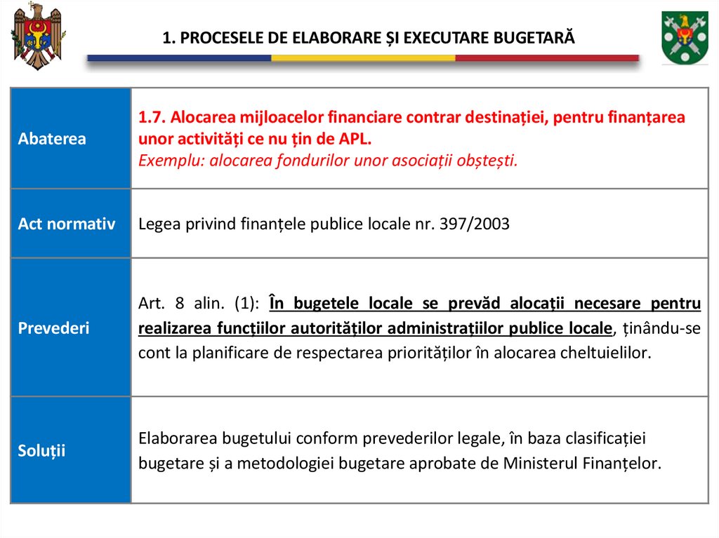 1.7. Alocarea mijloacelor financiare contrar destinației, pentru finanțarea