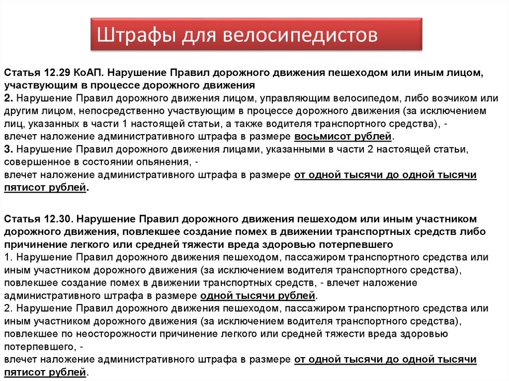 Штрафы для велосипедистовСтатья 12.29 КоАП. Нарушение Правил дорожного движения пешеходом или иным лицом,