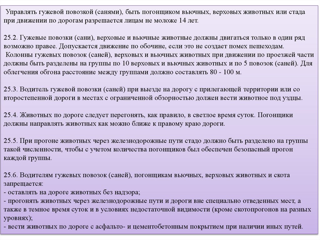 25.6. Водителям гужевых повозок (саней), погонщикам вьючных, верховых животных и скота
