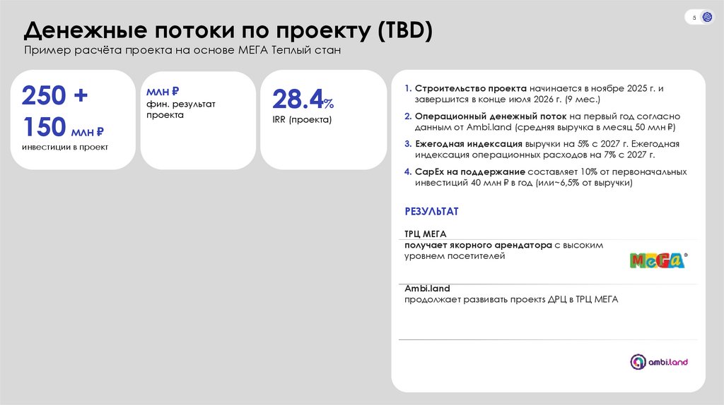 Денежные потоки по проекту (ТBD)Пример расчёта проекта на основе МЕГА Теплый стан