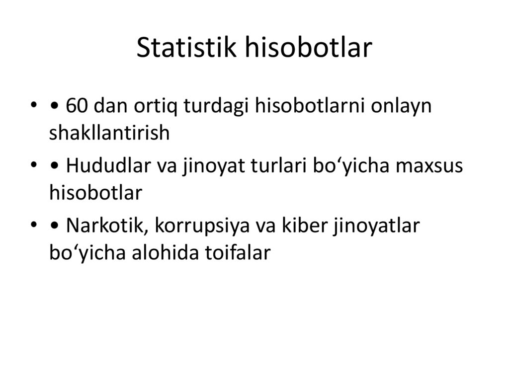 Statistik hisobotlar• • 60 dan ortiq turdagi hisobotlarni onlayn