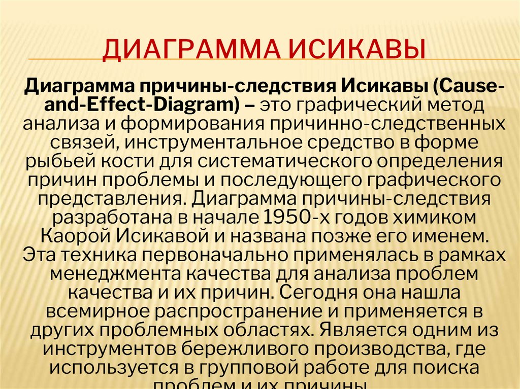 ДИАГРАММА ИСИКАВЫДиаграмма причины-следствия Исикавы (Causeand-Effect-Diagram) – это графический метод