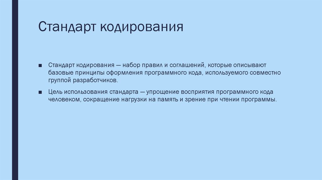 ■ Стандарт кодирования — набор правил и соглашений, которые описываютбазовые принципы оформления программного кода, используемого совместно