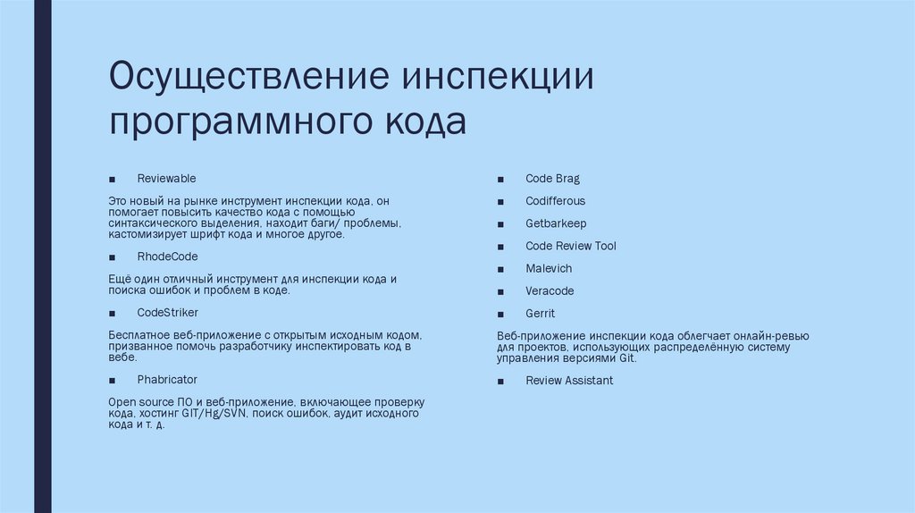 ■ Цель инспекции программного кода – обнаружение и исправлениеошибок, которые были пропущены, остались незамечены при