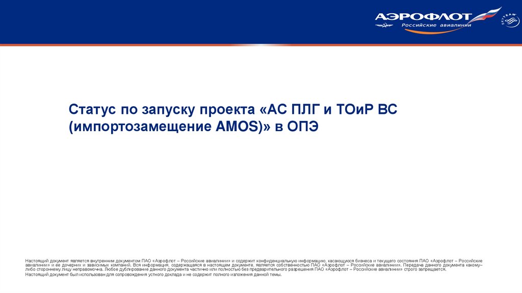 Настоящий документ является внутренним документом ПАО «Аэрофлот – Российские авиалинии» и содержит конфиденциальную информацию, касающуюся бизнеса и текущего состояния ПАО «Аэрофлот – Российскиеавиалинии» и ее дочерних и зависимых компаний. Вся информация, содержащаяся в настоящем документе, является собственностью ПАО «Аэрофлот – Российские авиалинии». Передача данного документа какому–