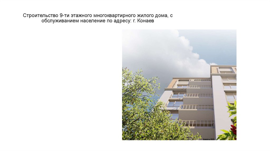 1. Строительство 9-ти этажного многоквартирного жилого дома, с обслуживанием население по адресу: г. Конаев