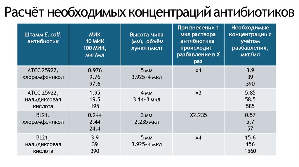 Расчёт необходимых концентраций антибиотиковПри внесении 1
