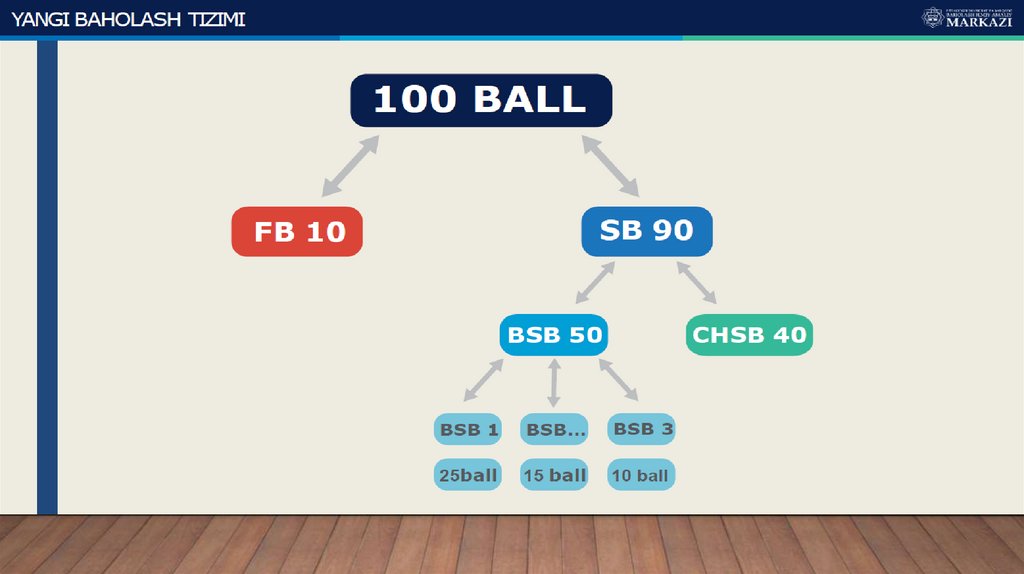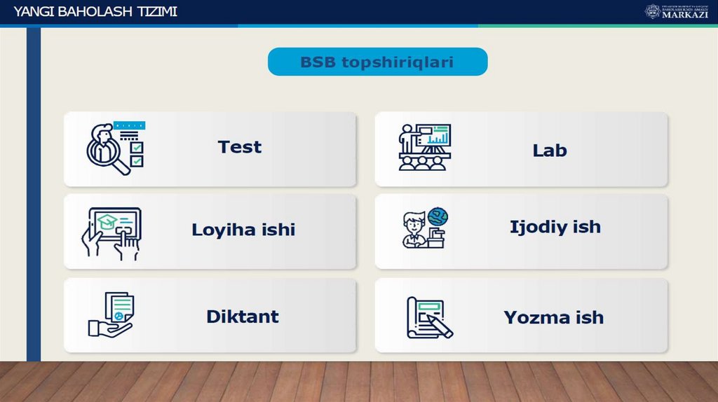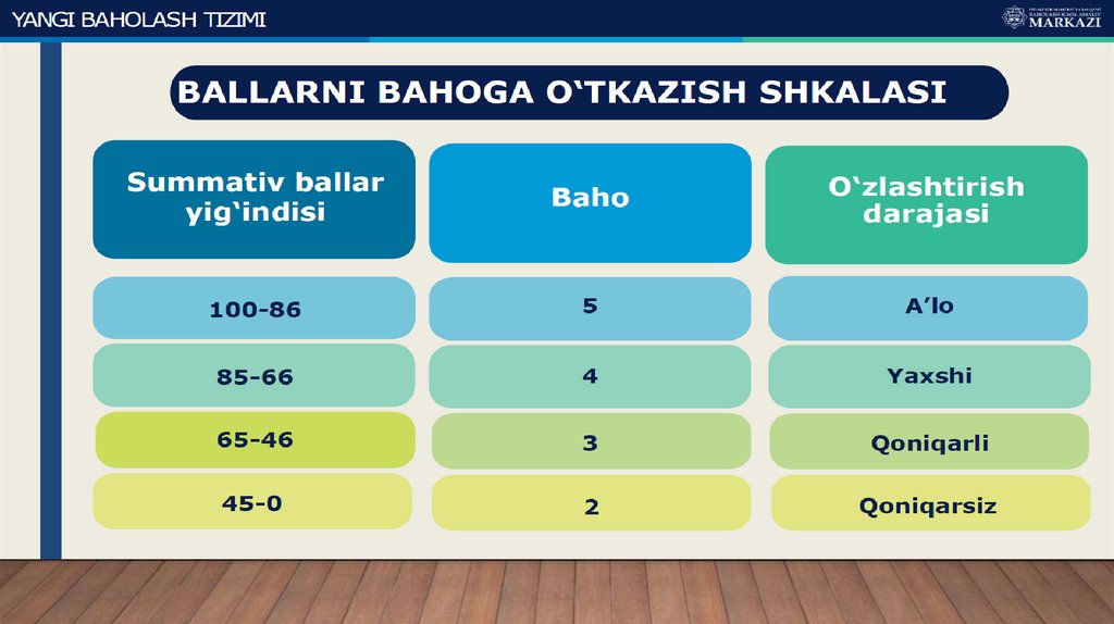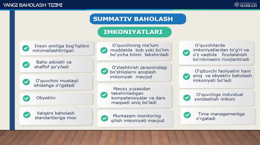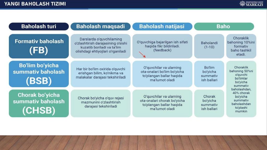• Yangi baholash tizimi ikki turga — summativ va formativ baholash tizimiga bo‘linadi.• Summativ baholash - ma’lum davrda yoki ma’lum bob yuzasidan berilgan bilimlarning darajasini