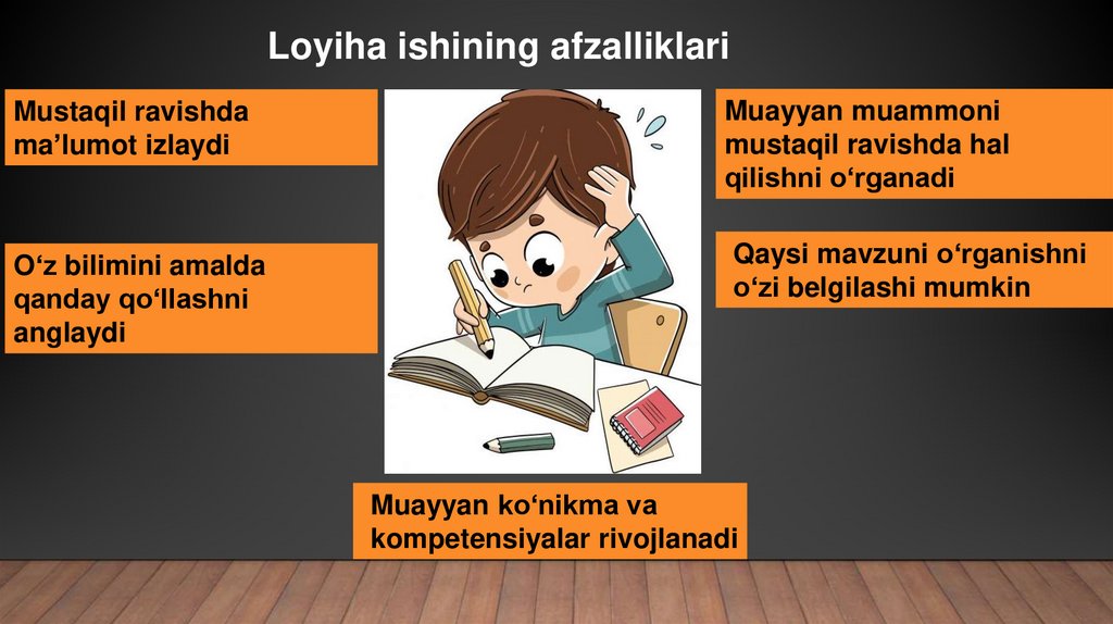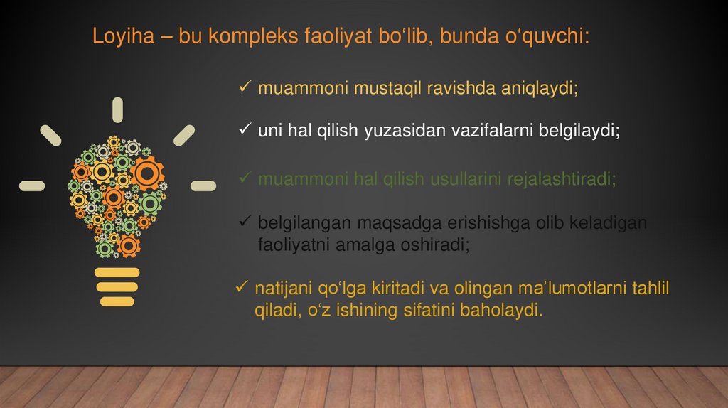 Loyiha – bu kompleks faoliyat bo‘lib, bunda o‘quvchi:muammoni mustaqil ravishda aniqlaydi;