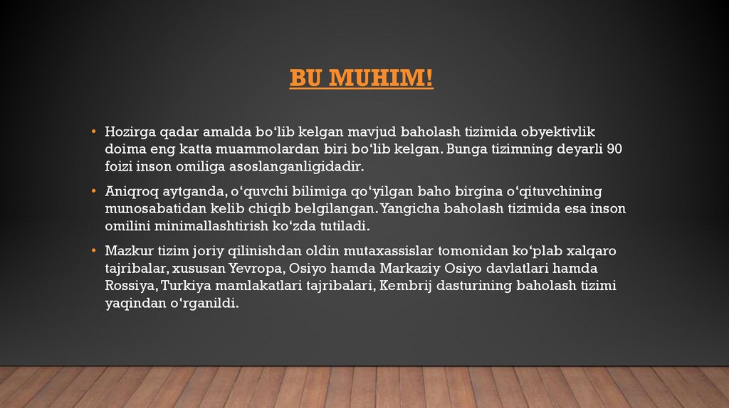 BU MUHIM!• Hozirga qadar amalda bo‘lib kelgan mavjud baholash tizimida obyektivlik
