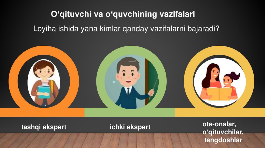 O‘qituvchi va o‘quvchining vazifalariLoyiha ishida yana kimlar qanday vazifalarni bajaradi?