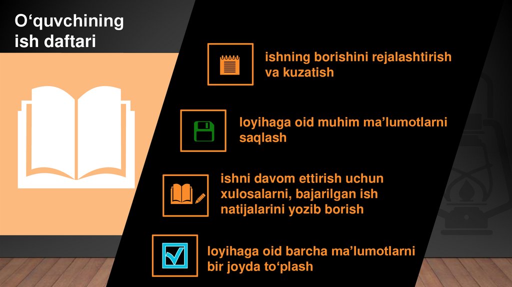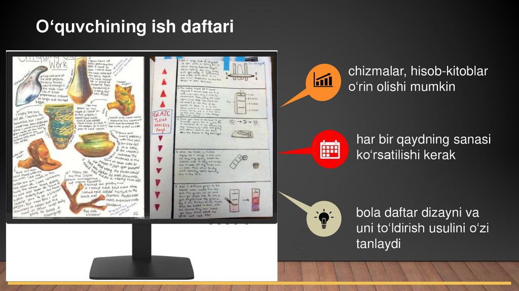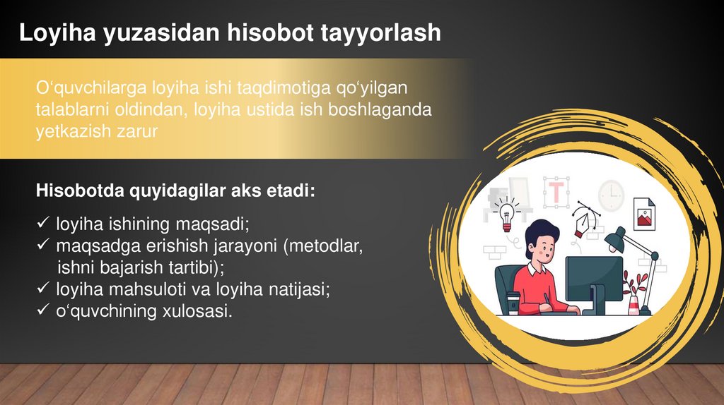 Loyiha yuzasidan hisobot tayyorlashO‘quvchilarga loyiha ishi taqdimotiga qo‘yilgan
