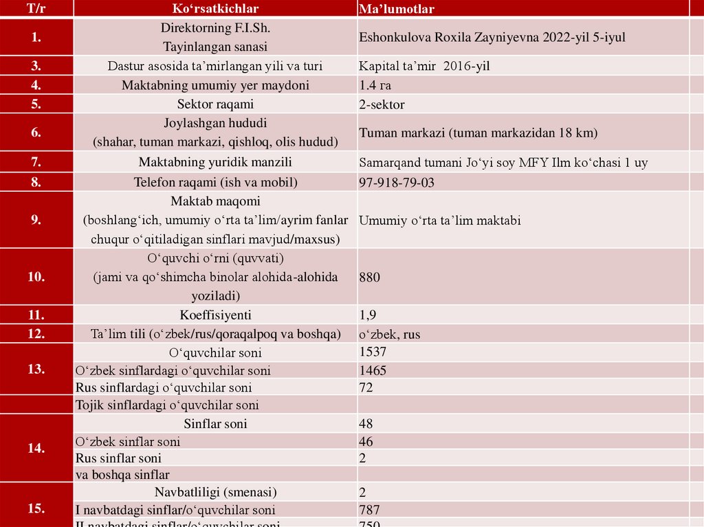 1. O‘zbekiston Respublikasi Xalq ta’lim vazirligi Samarqand viloyati xalq ta’lim boshqarmasi Samarqand tumani Maktabgacha va